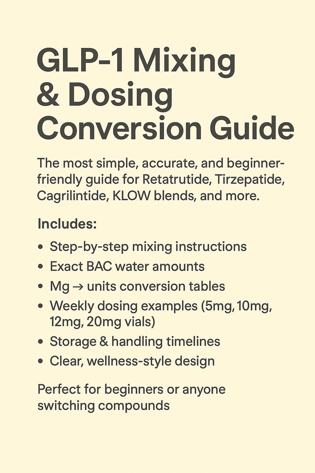 GLP-1 Mixing & Dosing Conversion Guide (Retatrutide, Tirzepatide, Cagrilintide)